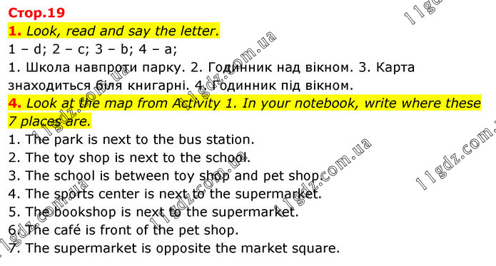 1. Look, read and say the letter. 1 – d; 2 – c; 3 – b; 4 – a; 1. Школа навпроти парку. 2. Годинник над вікном. 3. Карта знаходиться біля книгарні. 4. Годинник під вікном. 4. Look at the map from Activity 1. In your notebook, write where these 7 places are. 1. The park is next to the bus station. 2. The toy shop is next to the school. 3. The school is between toy shop and pet shop. 4. The sports center is next to the supermarket. 5. The bookshop is next to the supermarket. 6. The café is front of the pet shop. 7. The supermarket is opposite the market square.