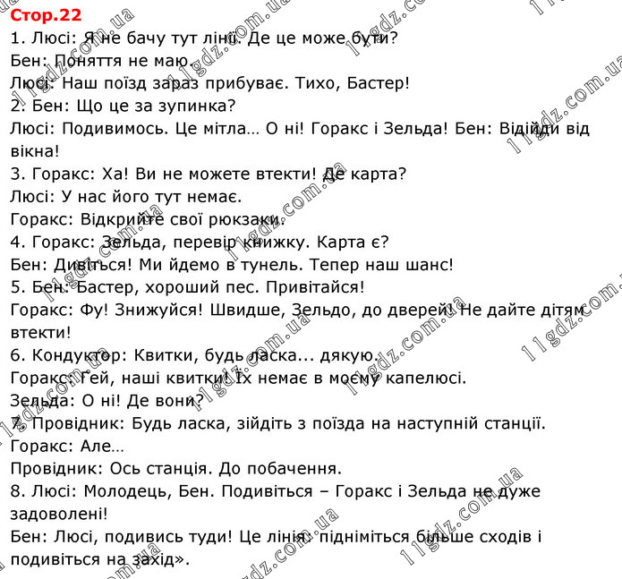 1. Люсі: Я не бачу тут лінії. Де це може бути? Бен: Поняття не маю. Люсі: Наш поїзд зараз прибуває. Тихо, Бастер! 2. Бен: Що це за зупинка? Люсі: Подивимось. Це мітла… О ні! Горакс і Зельда! Бен: Відійди від вікна! 3. Горакс: Ха! Ви не можете втекти! Де карта? Люсі: У нас його тут немає. Горакс: Відкрийте свої рюкзаки. 4. Горакс: Зельда, перевір книжку. Карта є? Бен: Дивіться! Ми йдемо в тунель. Тепер наш шанс! 5. Бен: Бастер, хороший пес. Привітайся! Горакс: Фу! Знижуйся! Швидше, Зельдо, до дверей! Не дайте дітям втекти! 6. Кондуктор: Квитки, будь ласка... дякую. Горакс: Гей, наші квитки! Їх немає в моєму капелюсі. Зельда: О ні! Де вони? 7. Провідник: Будь ласка, зійдіть з поїзда на наступній станції. Горакс: Але… Провідник: Ось станція. До побачення. 8. Люсі: Молодець, Бен. Подивіться – Горакс і Зельда не дуже задоволені! Бен: Люсі, подивись туди! Це лінія: підніміться більше сходів і подивіться на захід».
