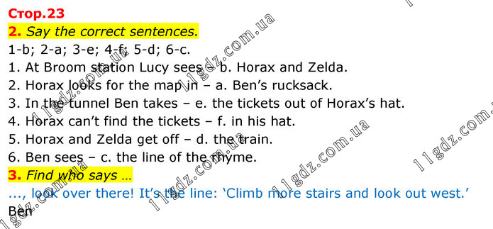 2. Say the correct sentences. 1-b; 2-a; 3-e; 4-f; 5-d; 6-c. 1. At Broom station Lucy sees – b. Horax and Zelda. 2. Horax looks for the map in – a. Ben’s rucksack. 3. In the tunnel Ben takes – e. the tickets out of Horax’s hat. 4. Horax can’t find the tickets – f. in his hat. 5. Horax and Zelda get off – d. the train. 6. Ben sees – c. the line of the rhyme. 3. Find who says … ..., look over there! It’s the line: ‘Climb more stairs and look out west.’ Ben
