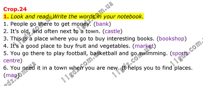 1. Look and read. Write the words in your notebook. 1. People go there to get money. (bank) 2. It’s old, and often next to a town. (castle) 3. This is a place where you go to buy interesting books. (bookshop) 4. It’s a good place to buy fruit and vegetables. (market) 5. You go there to play football, basketball and go swimming. (sports centre) 6. You need it in a town when you are new. It helps you to find places. (map)