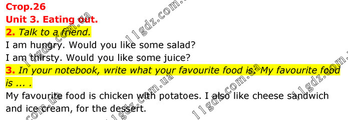 Unit 3. Eating out. 2. Talk to a friend. I am hungry. Would you like some salad? I am thirsty. Would you like some juice? 3. In your notebook, write what your favourite food is: My favourite food is ... . My favourite food is chicken with potatoes. I also like cheese sandwich and ice cream, for the dessert.