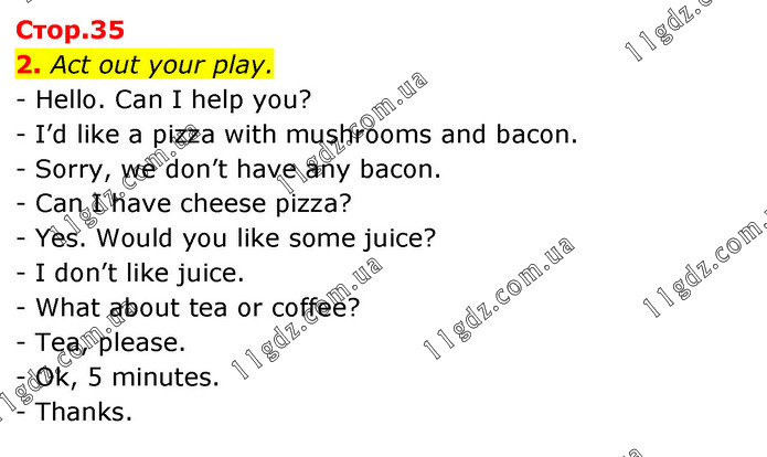 Act out your play. - Hello. Can I help you? - I’d like a pizza with mushrooms and bacon. - Sorry, we don’t have any bacon. - Can I have cheese pizza? - Yes. Would you like some juice? - I don’t like juice. - What about tea or coffee? - Tea, please. - Ok, 5 minutes. - Thanks.