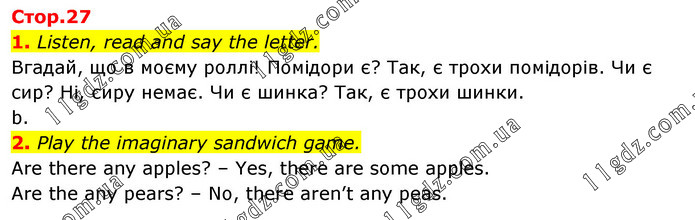 1. Listen, read and say the letter. Вгадай, що в моєму роллі! Помідори є? Так, є трохи помідорів. Чи є сир? Ні, сиру немає. Чи є шинка? Так, є трохи шинки. b. 2. Play the imaginary sandwich game. Are there any apples? – Yes, there are some apples. Are the any pears? – No, there aren’t any peas.