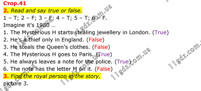 2. Read and say true or false. 1 – T; 2 – F; 3 – F; 4 – T; 5 – T; 6 – F. Imagine it’s 1980 … 1. The Mysterious H starts stealing jewellery in London. (True) 2. He’s a thief only in England. (False) 3. He steals the Queen’s clothes. (False) 4. The Mysterious H goes to Paris. (True) 5. He always leaves a note for the police. (True) 6. The note has the letter M on it. (False) 3. Find the royal person in the story. picture 3.