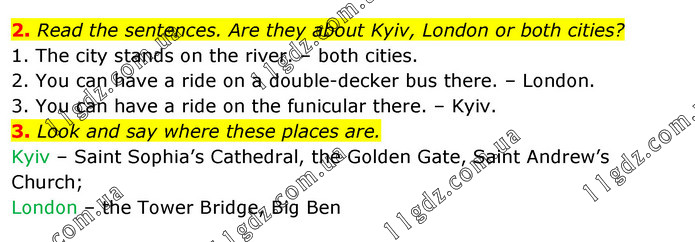 2. Read the sentences. Are they about Kyiv, London or both cities? 1. The city stands on the river. – both cities. 2. You can have a ride on a double-decker bus there. – London. 3. You can have a ride on the funicular there. – Kyiv. 3. Look and say where these places are. Kyiv – Saint Sophia’s Cathedral, the Golden Gate, Saint Andrew’s Church; London – the Tower Bridge, Big Ben