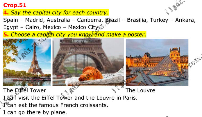 4. Say the capital city for each country. Spain – Madrid, Australia – Canberra, Brazil – Brasilia, Turkey – Ankara, Egypt – Cairo, Mexico – Mexico City. 5. Choose a capital city you know and make a poster. The Eiffel Tower The Louvre I can visit the Eiffel Tower and the Louvre in Paris. I can eat the famous French croissants. I can go there by plane.