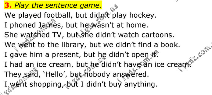 Play the sentence game. We played football, but didn’t play hockey. I phoned James, but he wasn’t at home. She watched TV, but she didn’t watch cartoons. We went to the library, but we didn’t find a book. I gave him a present, but he didn’t open it. I had an ice cream, but he didn’t have an ice cream. They said, ‘Hello’, but nobody answered. I went shopping, but I didn’t buy anything.