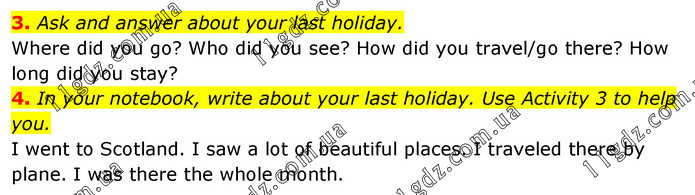 3. Ask and answer about your last holiday. Where did you go? Who did you see? How did you travel/go there? How long did you stay? 4. In your notebook, write about your last holiday. Use Activity 3 to help you. I went to Scotland. I saw a lot of beautiful places. I traveled there by plane. I was there the whole month.