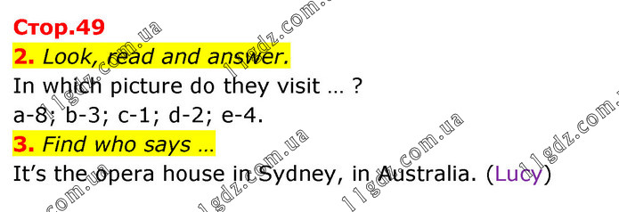 2. Look, read and answer. In which picture do they visit … ? a-8; b-3; c-1; d-2; e-4. 3. Find who says … It’s the opera house in Sydney, in Australia. (Lucy)