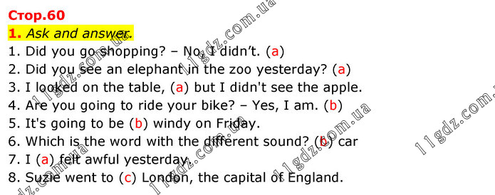 1. Ask and answer. 1. Did you go shopping? – No, I didn’t. (a) 2. Did you see an elephant in the zoo yesterday? (a) 3. I looked on the table, (a) but I didn't see the apple. 4. Are you going to ride your bike? – Yes, I am. (b) 5. It's going to be (b) windy on Friday. 6. Which is the word with the different sound? (b) car 7. I (a) felt awful yesterday. 8. Suzie went to (c) London, the capital of England.