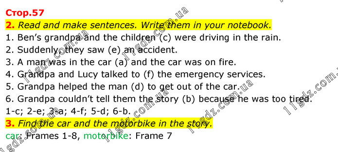 2. Read and make sentences. Write them in your notebook. 1. Ben’s grandpa and the children (c) were driving in the rain. 2. Suddenly, they saw (e) an accident. 3. A man was in the car (a) and the car was on fire. 4. Grandpa and Lucy talked to (f) the emergency services. 5. Grandpa helped the man (d) to get out of the car. 6. Grandpa couldn’t tell them the story (b) because he was too tired. 1-с; 2-e; 3-a; 4-f; 5-d; 6-b. 3. Find the car and the motorbike in the story. car: Frames 1-8, motorbike: Frame 7