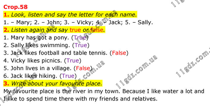 1. Look, listen and say the letter for each name. 1. – Mary; 2. – John; 3. – Vicky; 4. – Jack; 5. – Sally. 2. Listen again and say true or false. 1. Mary has got a pony. (True) 2. Sally likes swimming. (True) 3. Jack likes football and table tennis. (False) 4. Vicky likes picnics. (True) 5. John lives in a village. (False) 6. Jack likes hiking. (True) 3. Write about your favourite place. My favourite place is the river in my town. Because I like water a lot and I like to spend time there with my friends and relatives.