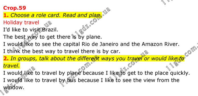 1. Choose a role card. Read and plan. Holiday travel I’d like to visit Brazil. The best way to get there is by plane. I would like to see the capital Rio de Janeiro and the Amazon River. I think the best way to travel there is by car. 2. In groups, talk about the different ways you travel or would like to travel. I would like to travel by plane because I like to get to the place quickly. I would like to travel by bus because I like to see the view from the window.