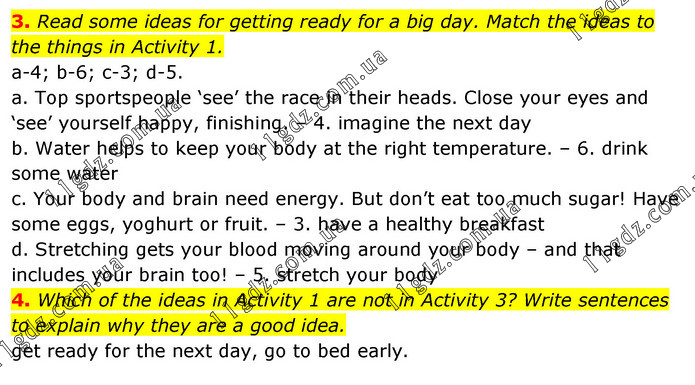 3. Read some ideas for getting ready for a big day. Match the ideas to the things in Activity 1. a-4; b-6; c-3; d-5. a. Top sportspeople ‘see’ the race in their heads. Close your eyes and ‘see’ yourself happy, finishing. – 4. imagine the next day b. Water helps to keep your body at the right temperature. – 6. drink some water c. Your body and brain need energy. But don’t eat too much sugar! Have some eggs, yoghurt or fruit. – 3. have a healthy breakfast d. Stretching gets your blood moving around your body – and that includes your brain too! – 5. stretch your body 4. Which of the ideas in Activity 1 are not in Activity 3? Write sentences to explain why they are a good idea. get ready for the next day, go to bed early.