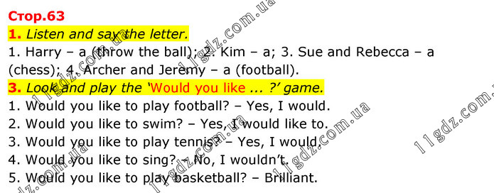 1. Listen and say the letter. 1. Harry – a (throw the ball); 2. Kim – a; 3. Sue and Rebecca – a (chess); 4. Archer and Jeremy – a (football). 3. Look and play the ‘Would you like ... ?’ game. 1. Would you like to play football? – Yes, I would. 2. Would you like to swim? – Yes, I would like to. 3. Would you like to play tennis? – Yes, I would. 4. Would you like to sing? – No, I wouldn’t. 5. Would you like to play basketball? – Brilliant.