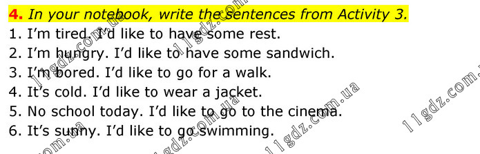 In your notebook, write the sentences from Activity 3. 1. I’m tired. I’d like to have some rest. 2. I’m hungry. I’d like to have some sandwich. 3. I’m bored. I’d like to go for a walk. 4. It’s cold. I’d like to wear a jacket. 5. No school today. I’d like to go to the cinema. 6. It’s sunny. I’d like to go swimming.