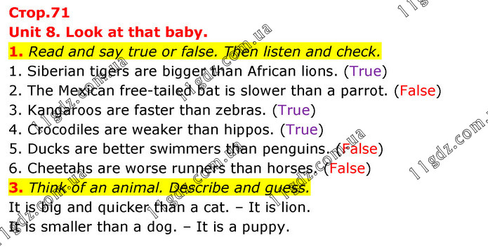 Unit 8. Look at that baby. 1. Read and say true or false. Then listen and check. 1. Siberian tigers are bigger than African lions. (True) 2. The Mexican free-tailed bat is slower than a parrot. (False) 3. Kangaroos are faster than zebras. (True) 4. Crocodiles are weaker than hippos. (True) 5. Ducks are better swimmers than penguins. (False) 6. Cheetahs are worse runners than horses. (False) 3. Think of an animal. Describe and guess. It is big and quicker than a cat. – It is lion. It is smaller than a dog. – It is a puppy.
