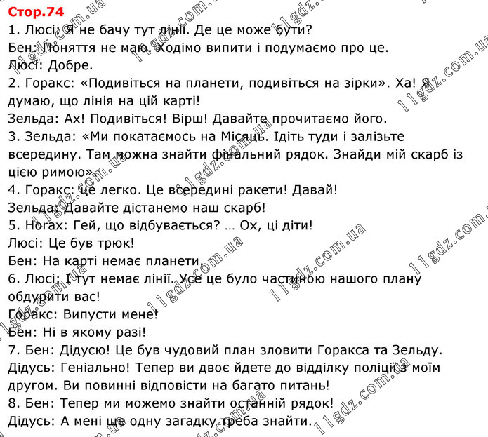 1. Люсі: Я не бачу тут лінії. Де це може бути? Бен: Поняття не маю. Ходімо випити і подумаємо про це. Люсі: Добре. 2. Горакс: «Подивіться на планети, подивіться на зірки». Ха! Я думаю, що лінія на цій карті! Зельда: Ах! Подивіться! Вірш! Давайте прочитаємо його. 3. Зельда: «Ми покатаємось на Місяць. Ідіть туди і залізьте всередину. Там можна знайти фінальний рядок. Знайди мій скарб із цією римою». 4. Горакс: це легко. Це всередині ракети! Давай! Зельда: Давайте дістанемо наш скарб! 5. Horax: Гей, що відбувається? … Ох, ці діти! Люсі: Це був трюк! Бен: На карті немає планети. 6. Люсі: І тут немає лінії. Усе це було частиною нашого плану обдурити вас! Горакс: Випусти мене! Бен: Ні в якому разі! 7. Бен: Дідусю! Це був чудовий план зловити Горакса та Зельду. Дідусь: Геніально! Тепер ви двоє йдете до відділку поліції з моїм другом. Ви повинні відповісти на багато питань! 8. Бен: Тепер ми можемо знайти останній рядок! Дідусь: А мені ще одну загадку треба знайти.