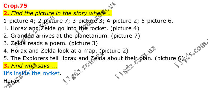2. Find the picture in the story where … 1-picture 4; 2-picture 7; 3-picture 3; 4-picture 2; 5-picture 6. 1. Horax and Zelda go into the rocket. (picture 4) 2. Grandpa arrives at the planetarium. (picture 7) 3. Zelda reads a poem. (picture 3) 4. Horax and Zelda look at a map. (picture 2) 5. The Explorers tell Horax and Zelda about their plan. (picture 6) 3. Find who says ... It’s inside the rocket. Horax