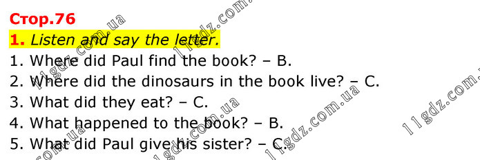 1. Listen and say the letter. 1. Where did Paul find the book? – B. 2. Where did the dinosaurs in the book live? – C. 3. What did they eat? – C. 4. What happened to the book? – B. 5. What did Paul give his sister? – C.