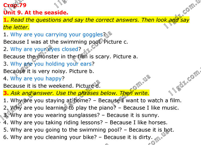 Unit 9. At the seaside. 1. Read the questions and say the correct answers. Then look and say the letter. 1. Why are you carrying your goggles? Because I was at the swimming pool. Picture c. 2. Why are your eyes closed? Because the monster in the film is scary. Picture a. 3. Why are you holding your ears? Because it is very noisy. Picture b. 4. Why are you happy? Because it is the weekend. Picture d. 3. Ask and answer. Use the phrases below. Then write. 1. Why are you staying at home? – Because I want to watch a film. 2. Why are you learning to play the piano? – Because I like music. 3. Why are you wearing sunglasses? – Because it is sunny. 4. Why are you taking riding lessons? – Because I like horses. 5. Why are you going to the swimming pool? – Because it is hot. 6. Why are you cleaning your bike? – Because it is dirty.