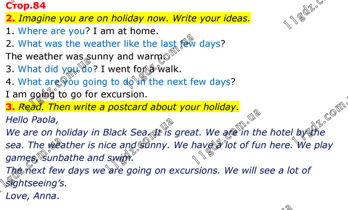 2. Imagine you are on holiday now. Write your ideas. 1. Where are you? I am at home. 2. What was the weather like the last few days? The weather was sunny and warm. 3. What did you do? I went for a walk. 4. What are you going to do in the next few days? I am going to go for excursion. 3. Read. Then write a postcard about your holiday. Hello Paola, We are on holiday in Black Sea. It is great. We are in the hotel by the sea. The weather is nice and sunny. We have a lot of fun here. We play games, sunbathe and swim. The next few days we are going on excursions. We will see a lot of sightseeing’s. Love, Anna.