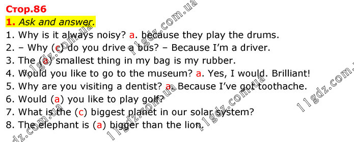 1. Ask and answer. 1. Why is it always noisy? a. because they play the drums. 2. – Why (c) do you drive a bus? – Because I’m a driver. 3. The (a) smallest thing in my bag is my rubber. 4. Would you like to go to the museum? a. Yes, I would. Brilliant! 5. Why are you visiting a dentist? a. Because I’ve got toothache. 6. Would (a) you like to play golf? 7. What is the (c) biggest planet in our solar system? 8. The elephant is (a) bigger than the lion.