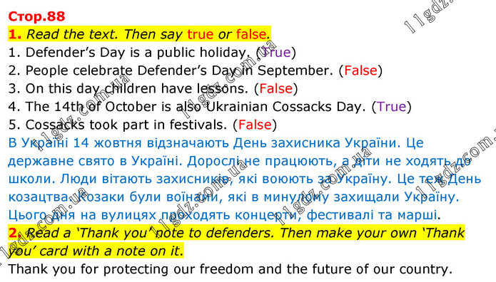 1. Read the text. Then say true or false. 1. Defender’s Day is a public holiday. (True) 2. People celebrate Defender’s Day in September. (False) 3. On this day children have lessons. (False) 4. The 14th of October is also Ukrainian Cossacks Day. (True) 5. Cossacks took part in festivals. (False) В Україні 14 жовтня відзначають День захисника України. Це державне свято в Україні. Дорослі не працюють, а діти не ходять до школи. Люди вітають захисників, які воюють за Україну. Це теж День козацтва. Козаки були воїнами, які в минулому захищали Україну. Цього дня на вулицях проходять концерти, фестивалі та марші. 2. Read a ‘Thank you’ note to defenders. Then make your own ‘Thank you’ card with a note on it. Thank you for protecting our freedom and the future of our country.