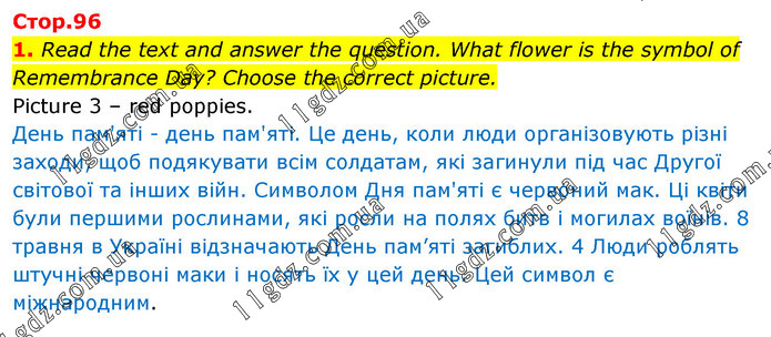 1. Read the text and answer the question. What flower is the symbol of Remembrance Day? Choose the correct picture. Picture 3 – red poppies. День пам'яті - день пам'яті. Це день, коли люди організовують різні заходи, щоб подякувати всім солдатам, які загинули під час Другої світової та інших війн. Символом Дня пам'яті є червоний мак. Ці квіти були першими рослинами, які росли на полях битв і могилах воїнів. 8 травня в Україні відзначають День пам’яті загиблих. 4 Люди роблять штучні червоні маки і носять їх у цей день. Цей символ є міжнародним.