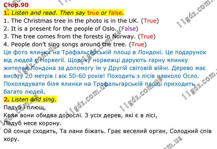 1. Listen and read. Then say true or false. 1. The Christmas tree in the photo is in the UK. (True) 2. It is a present for the people of Oslo. (False) 3. The tree comes from the forests in Norway. (True) 4. People don’t sing songs around the tree. (True) Це фото ялинки на Трафальгарській площі в Лондоні. Це подарунок від людей у Норвегії. Щороку норвежці дарують гарну ялинку жителям Лондона за допомогу їм у Другій світовій війні. Дерево має висоту 20 метрів і вік 50-60 років! Походить з лісів навколо Осло. Поколядувати біля ялинки на Трафальгарській площі приходить багато людей. 2. Listen and sing. Падуб і плющ, Коли вони обидва дорослі. З усіх дерев, які є в лісі, Падуб несе корону. Ой сонце сходить, Та лани біжать. Грає веселий орган, Солодкий спів хору.
