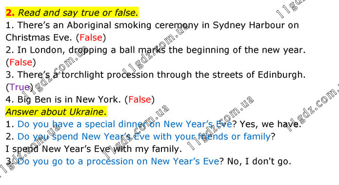 2. Read and say true or false. 1. There’s an Aboriginal smoking ceremony in Sydney Harbour on Christmas Eve. (False) 2. In London, dropping a ball marks the beginning of the new year. (False) 3. There’s a torchlight procession through the streets of Edinburgh. (True) 4. Big Ben is in New York. (False) Answer about Ukraine. 1. Do you have a special dinner on New Year’s Eve? Yes, we have. 2. Do you spend New Year’s Eve with your friends or family? I spend New Year’s Eve with my family. 3. Do you go to a procession on New Year’s Eve? No, I don't go.