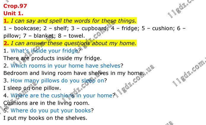 Unit 1. 1. I can say and spell the words for these things. 1 – bookcase; 2 – shelf; 3 – cupboard; 4 – fridge; 5 – cushion; 6 – pillow; 7 – blanket; 8 – towel. 2. I can answer these questions about my home. 1. What’s inside your fridge? There are products inside my fridge. 2. Which rooms in your home have shelves? Bedroom and living room have shelves in my home. 3. How many pillows do you sleep on? I sleep on one pillow. 4. Where are the cushions in your home? Cushions are in the living room. 5. Where do you put your books? I put my books on the shelves.
