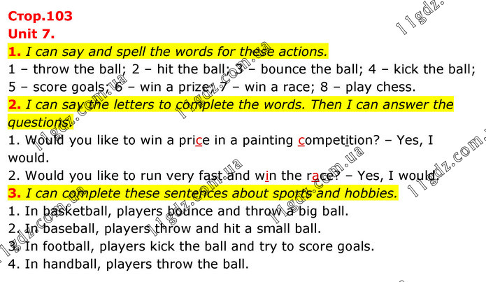 Unit 7. 1. I can say and spell the words for these actions. 1 – throw the ball; 2 – hit the ball; 3 – bounce the ball; 4 – kick the ball; 5 – score goals; 6 – win a prize; 7 – win a race; 8 – play chess. 2. I can say the letters to complete the words. Then I can answer the questions. 1. Would you like to win a price in a painting competition? – Yes, I would. 2. Would you like to run very fast and win the race? – Yes, I would. 3. I can complete these sentences about sports and hobbies. 1. In basketball, players bounce and throw a big ball. 2. In baseball, players throw and hit a small ball. 3. In football, players kick the ball and try to score goals. 4. In handball, players throw the ball.
