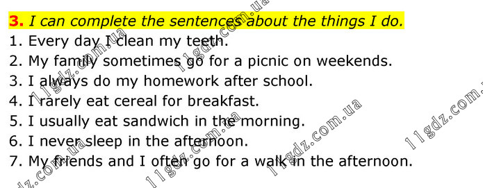I can complete the sentences about the things I do. 1. Every day I clean my teeth. 2. My family sometimes go for a picnic on weekends. 3. I always do my homework after school. 4. I rarely eat cereal for breakfast. 5. I usually eat sandwich in the morning. 6. I never sleep in the afternoon. 7. My friends and I often go for a walk in the afternoon.