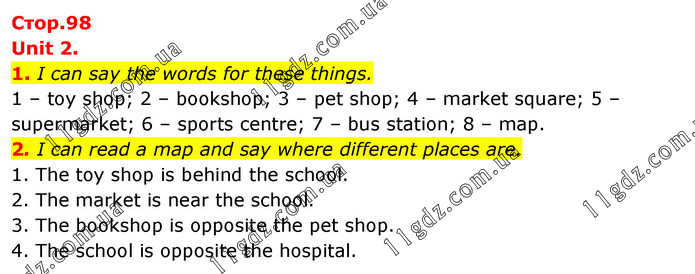 Unit 2. 1. I can say the words for these things. 1 – toy shop; 2 – bookshop; 3 – pet shop; 4 – market square; 5 – supermarket; 6 – sports centre; 7 – bus station; 8 – map. 2. I can read a map and say where different places are. 1. The toy shop is behind the school. 2. The market is near the school. 3. The bookshop is opposite the pet shop. 4. The school is opposite the hospital.
