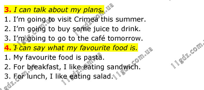 3. I can talk about my plans. 1. I’m going to visit Crimea this summer. 2. I’m going to buy some juice to drink. 3. I’m going to go to the café tomorrow. 4. I can say what my favourite food is. 1. My favourite food is pasta. 2. For breakfast, I like eating sandwich. 3. For lunch, I like eating salad.