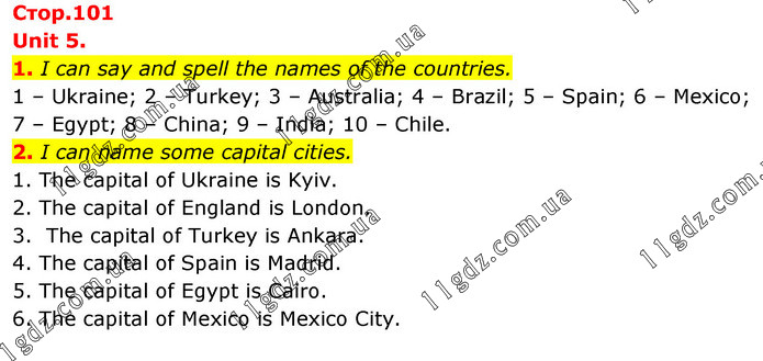 Unit 5. 1. I can say and spell the names of the countries. 1 – Ukraine; 2 – Turkey; 3 – Australia; 4 – Brazil; 5 – Spain; 6 – Mexico; 7 – Egypt; 8 – China; 9 – India; 10 – Chile. 2. I can name some capital cities. 1. The capital of Ukraine is Kyiv. 2. The capital of England is London. 3. The capital of Turkey is Ankara. 4. The capital of Spain is Madrid. 5. The capital of Egypt is Cairo. 6. The capital of Mexico is Mexico City.
