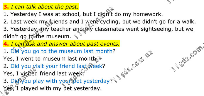 3. I can talk about the past. 1. Yesterday I was at school, but I didn’t do my homework. 2. Last week my friends and I went cycling, but we didn’t go for a walk. 3. Yesterday, my teacher and my classmates went sightseeing, but we didn’t go to the museum. 4. I can ask and answer about past events. 1. Did you go to the museum last month? Yes, I went to museum last month. 2. Did you visit your friend last week? Yes, I visited friend last week. 3. Did you play with your pet yesterday? Yes, I played with my pet yesterday.