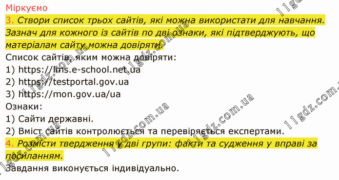 Створи список трьох сайтів, які можна використати для навчання. Зазнач для кожного із сайтів по дві ознаки, які підтверджують, що матеріалам сайту можна довіряти. Список сайтів, яким можна довіряти: 1) https://lms.e-school.net.ua 2) https://testportal.gov.ua 3) https://mon.gov.ua/ua Ознаки: 1) Сайти державні. 2) Вміст сайтів контролюється та перевіряється експертами. 4. Розмісти твердження у дві групи: факти та судження у вправі за посиланням. Завдання виконується індивідуально.