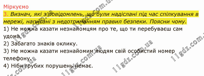 Визнач, які з повідомлень, що були надіслані під час спілкування в мережі, написані з недотриманням правил безпеки. Поясни чому. 1) Не можна казати незнайомцям про те, що ти перебуваєш сам удома. 2) Забагато знаків оклику. 3) Не можна казати незнайомим людям свій особистий номер телефону. 4) Ніби грубих порушень немає.