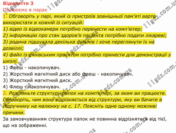 Обговоріть у парі, який із пристроїв зовнішньої пам’яті варто використати в кожній із ситуацій: 1) відео із відеокамери потрібно перенести на комп’ютер; 2) інформацію про стан здоров’я пацієнта потрібно подати лікареві; 3) родина підшукала декілька фільмів і хоче переглянути їх на дозвіллі; 4) файл із учнівським проєктом потрібно принести для демонстрації у школі. 1) Флеш - накопичувач. 2) Жорсткий магнітний диск або флеш - накопичувач. 3) Жорсткий магнітний диск. 4) Флеш - накопичувач. 2. Розгляньте структуру папок на комп’ютері, за яким ви працюєте. Обговоріть, чим вона відрізняється від структури, яку ви бачите в підручнику на малюнку на с. 17. Поясніть одне одному можливі причини. За замовчуванням структура папок не повинна відрізнятися від тієї, що на зображенні.