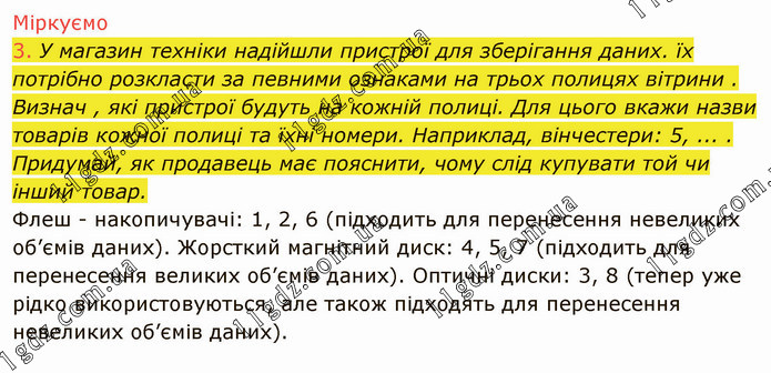 У магазин техніки надійшли пристрої для зберігання даних. їх потрібно розкласти за певними ознаками на трьох полицях вітрини . Визнач , які пристрої будуть на кожній полиці. Для цього вкажи назви товарів кожної полиці та їхні номери. Наприклад, вінчестери: 5, ... . Придумай, як продавець має пояснити, чому слід купувати той чи інший товар. Флеш - накопичувачі: 1, 2, 6 (підходить для перенесення невеликих об’ємів даних). Жорсткий магнітний диск: 4, 5, 7 (підходить для перенесення великих об’ємів даних). Оптичні диски: 3, 8 (тепер уже рідко використовуються, але також підходять для перенесення невеликих об’ємів даних).