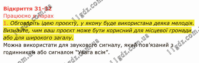 Обговоріть ідею проєкту, у якому буде використана деяка мелодія. Визначте, чим ваш проєкт може бути корисний для місцевої громади або для широкого загалу. Можна використати для звукового сигналу, який пов’язаний з годинником або сигналом “Увага всім”.