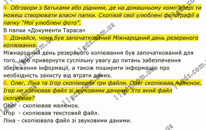 Обговори з батьками або рідними, де на домашньому комп’ютері ти можеш створювати власні папки. Скопіюй свої улюблені фотографії в папку “Мої улюблені фото”. В папки «Документи Тараса» 5. Дізнайся, чому був започаткований Міжнародний день резервного копіювання. Міжнародний день резервного копіювання був започаткований для того, щоб привернути суспільну увагу до питань забезпечення збереження інформації, а також поширити інформацію про необхідність захисту від втрати даних. 6. Олег, Ліна та Ігор скопіювали три файли. Олег скопіював малюнок. Ігор не копіював файл зі звуковими даними. Хто який файл скопіював? Олег - скопіював малюнок. Ігор - скопіював текстовий файл. Ліна - скопіювала файл зі звуковими даними.