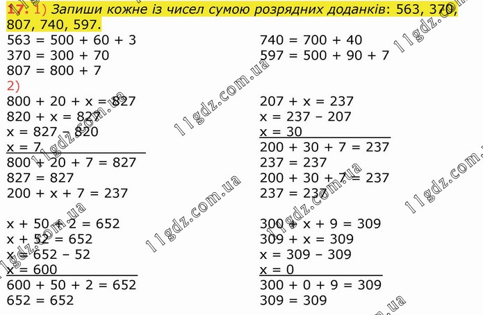 1) Запиши кожне із чисел сумою розрядних доданків: 563, 370, 807, 740, 597. 800 + 20 + х = 827 х + 50 + 2 = 652 207 + х = 237