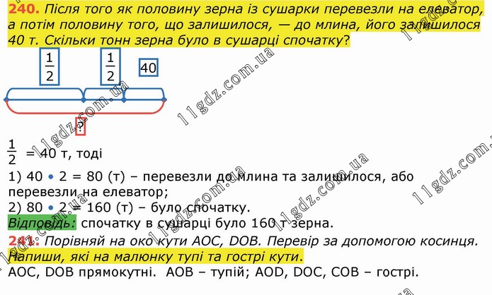 Після того як половину зерна із сушарки перевезли на елеватор, а потім половину того, що залишилося, — до млина, його залишилося 40 т. Скільки тонн зерна було в сушарці спочатку? Порівняй на око кути АОС, DОВ. Перевір за допомогою косинця. Напиши, які на малюнку тупі та гострі кути.