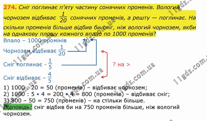 Сніг поглинає п’яту частину сонячних променів. Вологий чорнозем відбиває 1/20 сонячних променів, а решту — поглинає. На скільки променів більше відбив би сніг, ніж вологий чорнозем, якби на однакову площу кожного впало по 1000 променів?