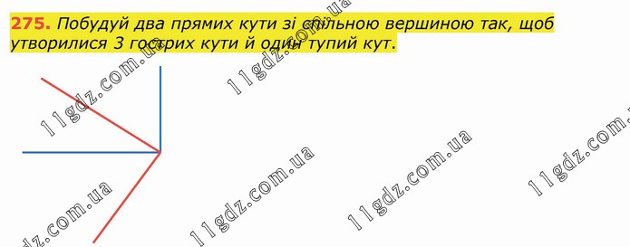 Побудуй два прямих кути зі спільною вершиною так, щоб утворилися 3 гострих кути й один тупий кут.