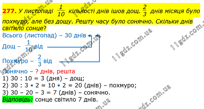 У листопаді 1/10 кількості днів ішов дощ. 2/3 днів місяця було похмуро, але без дощу. Решту часу було сонячно. Скільки днів світило сонце? 1) 30 : 10 = 3 (дня) – дощ; 2) 30 : 3 • 2 = 10 • 2 = 20 (днів) – похмуро; 3) 30 – 20 – 3 = 7 (днів) – сонячно. Відповідь: сонце світило 7 днів.