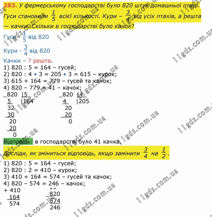 У фермерському господарстві було 820 штук домашньої птиці. Гуси становили 1/5 всієї кількості. Кури – 3/4 від усіх птахів, а решта — качки. Скільки в господарстві було качок? Досліди, як зміниться відповідь, якщо замінити 3/4 на 1/2 .